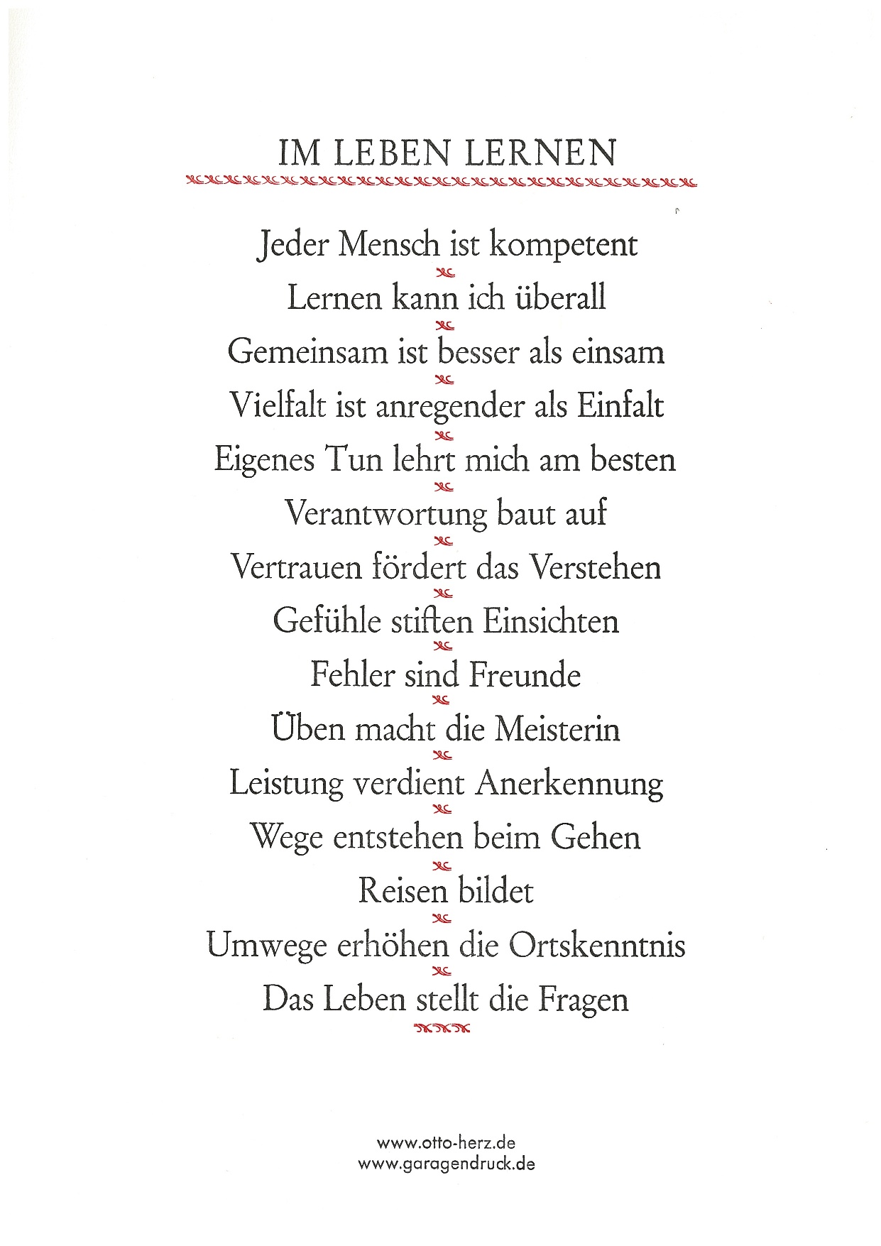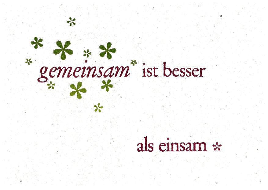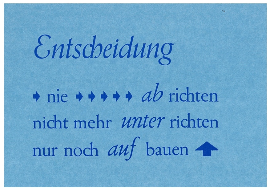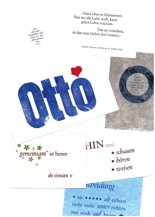 Diese „Herz-Sätze“ sind Inspiration für ungewöhnliche typografische Gestaltungen, meist auf A 6 (die Karten) oder A 5 – A 3-Formaten (die Plakate und Einblattdrucke). Die Auswahl der Papiere und Kartons erfolgt in Abstimmung zum Inhalt der Sätze: