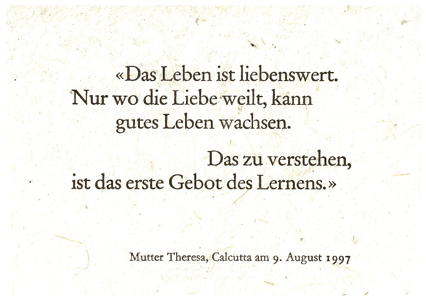 So werden indische Papiere für die in Darjeeling gefundenen „33 Qualities“ ausgewählt und leicht strukturierte Kartons, farblich variiert (Murillo) zu den Kernaussagen wie „Hin-schauen/-hören/-weisen“.